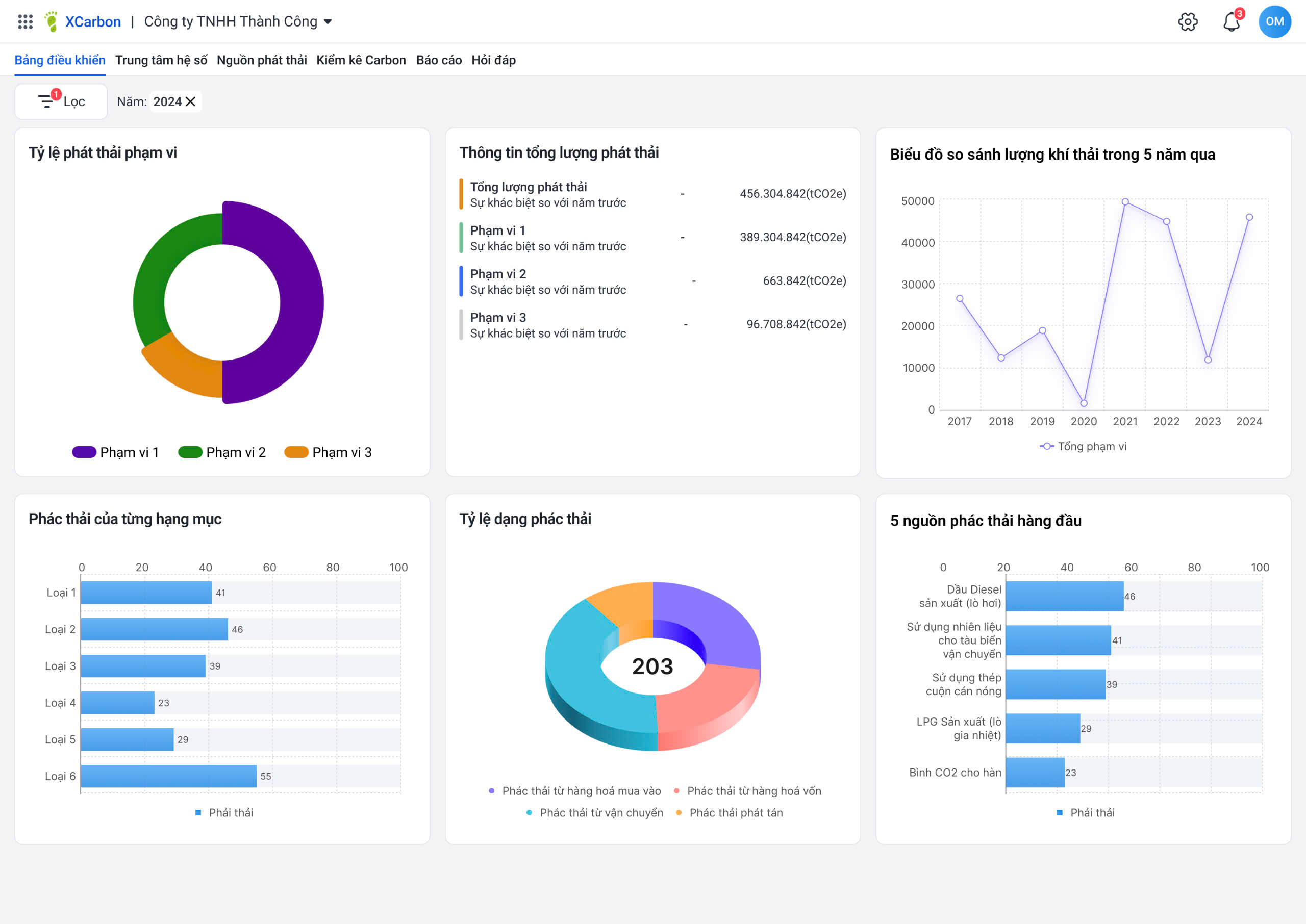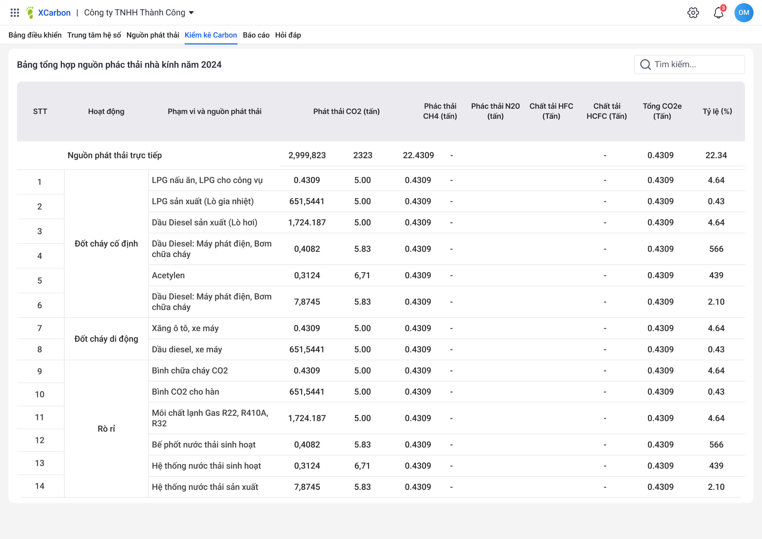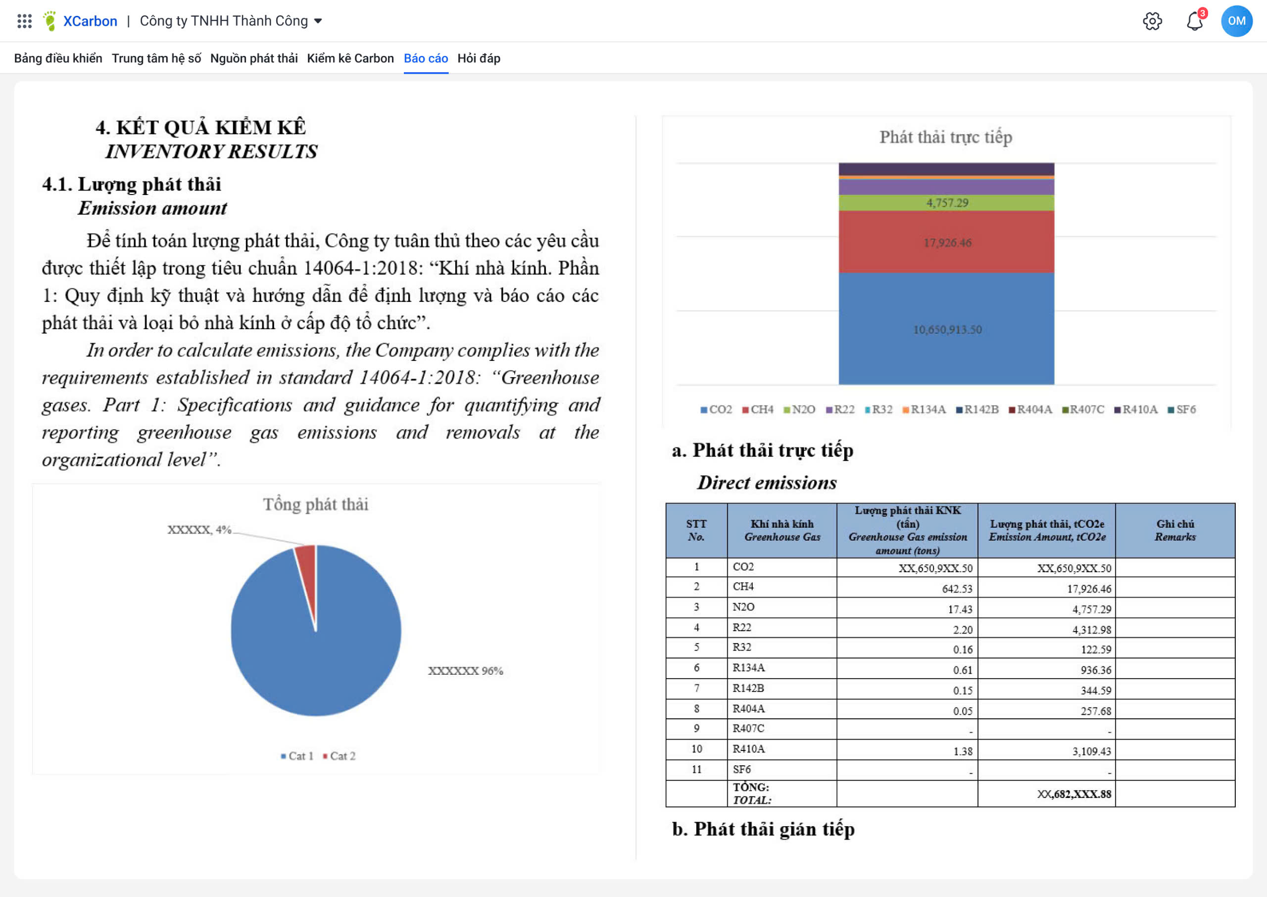 Phần mềm XCarbon được thiết kế đáp ứng tiêu chuẩn ISO 14064-1 và Nghị định 06/2022/NĐ-CP theo mục đích báo cáo của doanh nghiệp. Xcarbon giúp doanh nghiệp tính toán lượng phát thải khí nhà kính của tổ chức mình cùng các chi nhánh/nhà máy trong hệ thống tùy theo cấu trúc quản lý. Bằng cách cung cấp các phương pháp tính toán, hệ số phát thải của từng nguồn khí nhà kính theo thứ tự ưu tiên, đo đạc trực tiếp, QD2626, IPCC GHG glotocol EPA, dự báo, so sánh liên doanh nghiệp,… hay xác định hệ số GWP phù hợp với hệ số, công thức dự tính: IPCC, US, UK,..,và những gợi ý mẫu sổ phát thải theo ngành nghề, doanh nghiệp có thể đơn giản hóa việc báo cáo và theo dõi lượng phát thải khí nhà kính của doanh nghiệp mình.