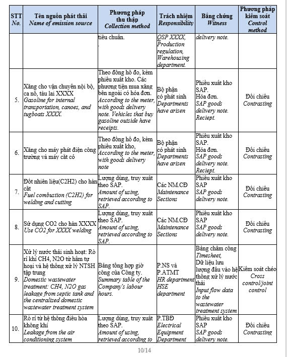 Doanh nghiệp có thể thực hiện thu thập các dữ liệu phát thải: ghi nhận từ hóa đơn, chứng từ mua hàng, kết quả quan trắc, hợp đồng, ... trong kì thời gian báo cáo là 1 năm.